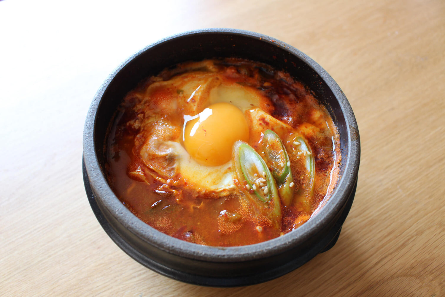 豆腐がメインの辛い鍋料理。シェフ自家製のタレで作った辛いスープは、辛さの中に旨味が凝縮して、ただ辛いだけではない、やさしくて奥深い味わいです。